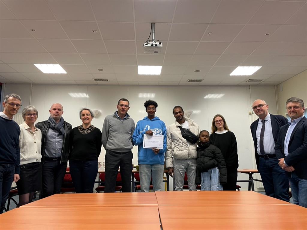 La cérémonie de remise de bourse s’est tenue vendredi 26 janvier en salle des conseils du Lycée RENOIR Angers en présence du proviseur, du proviseur adjoint, des deux professeurs principaux de Christian en Maths et en Physique, de la représentante de la vie scolaire (CPE), de la directrice de l’ENSAM Angers, du président GT Anjou et du parrain de Christian.